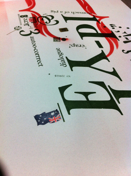 Experimental type and mark-making dialogue. Mixing mediums and techniques-letterpress, water transfer, stencil painting and rotary stamp. Leigh Whetter 2015.